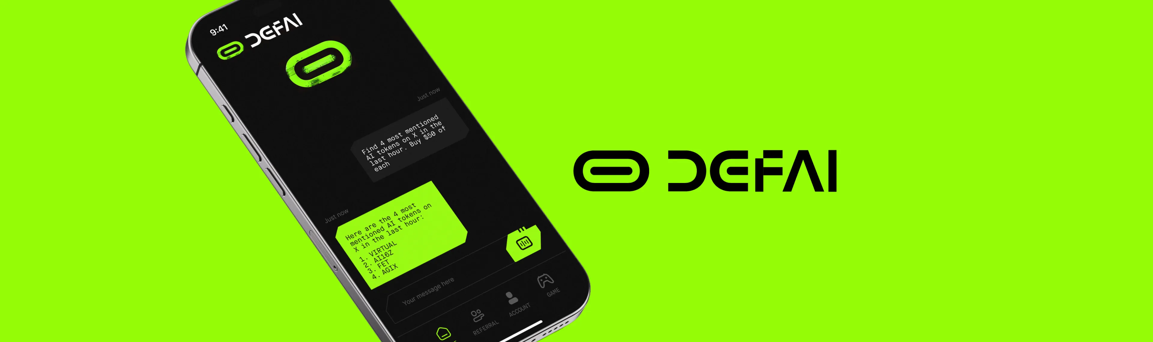 DeFAI engaged KNSY to design and visualise the AI chatbot layer of its DeFi application. The goal was to clearly communicate how conversational interaction could coordinate trading actions and wallet activity in real time. Beyond UI design, the product needed to be transformed into a high-impact launch asset — combining refined interface design with 2D and 3D animation to demonstrate functionality, build credibility and support market introduction.